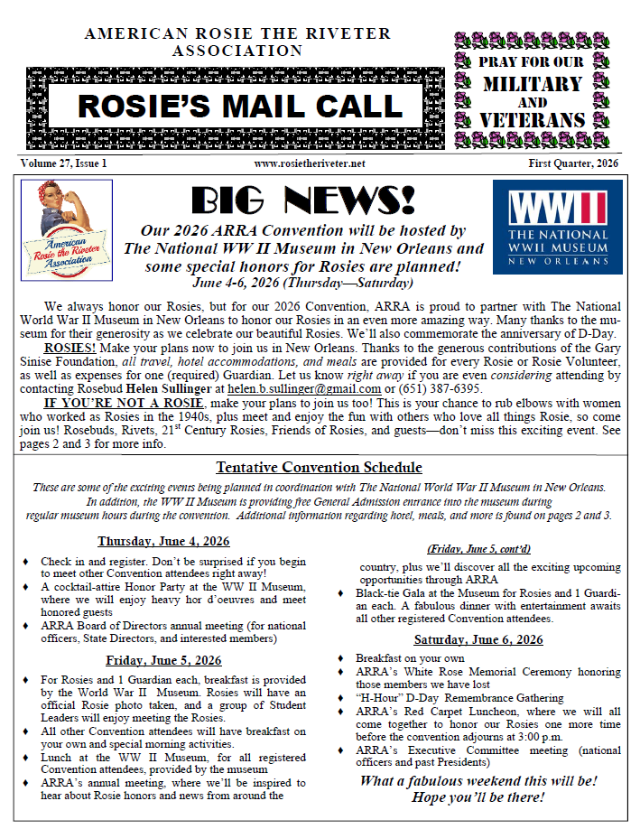 Our 2026 ARRA Convention will be hosted by The National WW II Museum in New Orleans and some special honors for Rosies are planned!